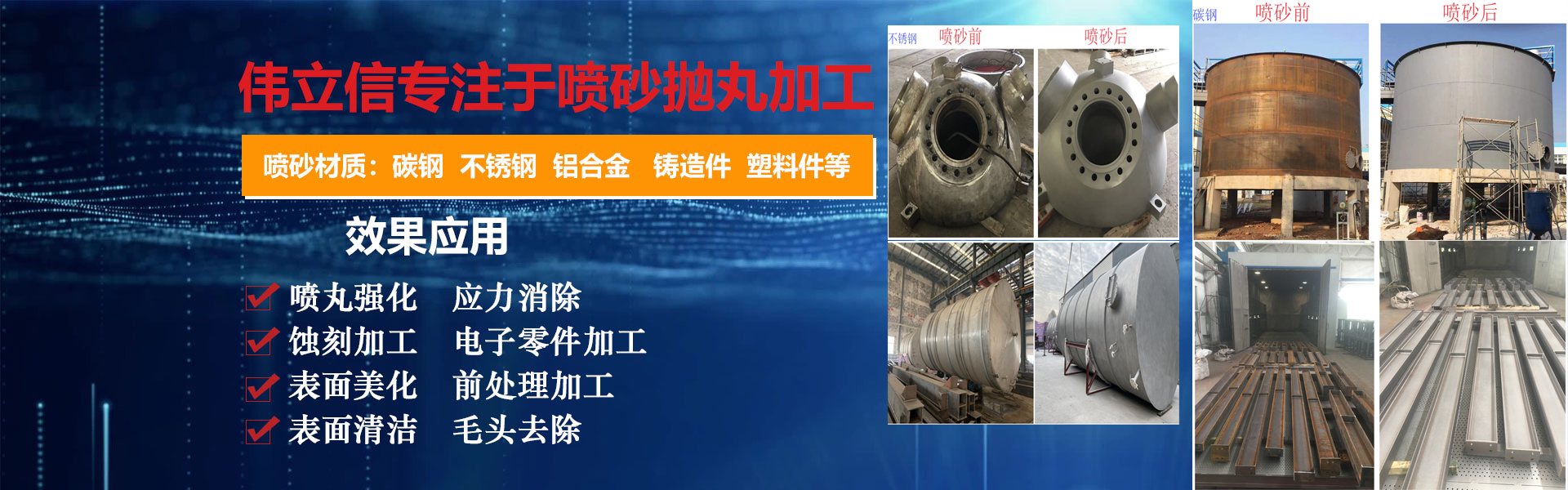 武漢偉立信機(jī)械設(shè)備有限公司(噴砂熱線:18186495283)是一家從事表面涂裝和表面清理設(shè)備的廠家,公司位于武漢市武昌區(qū)。是一家集表面涂裝和表面清理設(shè)備科研、開發(fā)、生產(chǎn)、銷售、服務(wù)于一體的綜合型企業(yè)。     公司自創(chuàng)建以來,一直秉持認(rèn)真、負(fù)責(zé)的態(tài)度,以其科學(xué)而嚴(yán)密的管理,先進(jìn)而不斷創(chuàng)新的技術(shù),致力于表面處理設(shè)備的研制和開發(fā),主要產(chǎn)品有:手動(dòng)噴砂機(jī)、自動(dòng)噴砂機(jī)、開放式加壓噴砂機(jī)、干濕式噴砂機(jī)及大型噴砂房,拋丸機(jī),除塵設(shè)備,另可根據(jù)客戶要求定做。低價(jià)經(jīng)營(yíng)各類噴砂磨料:玻璃珠、鋼砂、鋼丸、不銹鋼丸、鋼絲切丸···